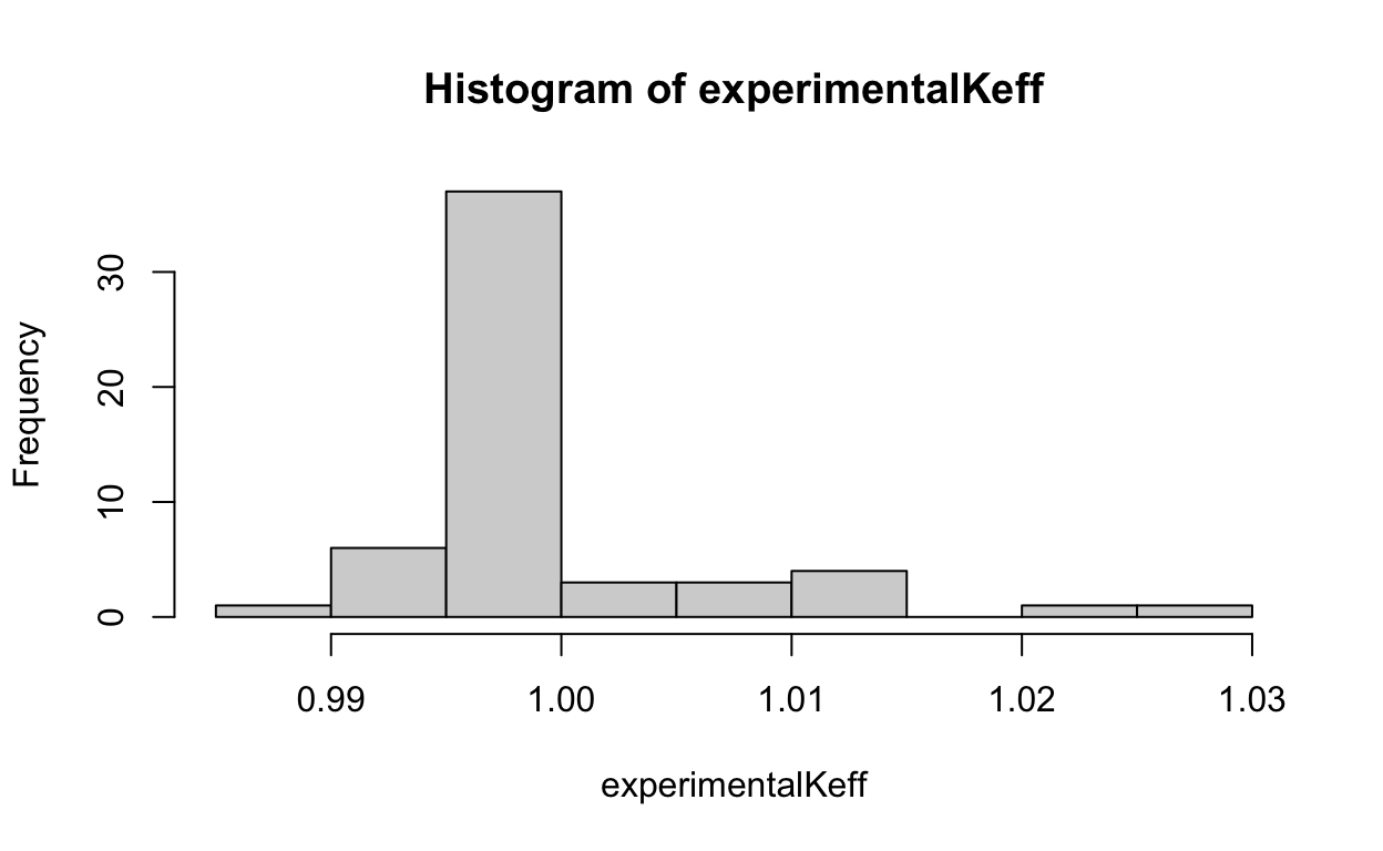 Repeating the same exercise as with the previous case, the average experimental keff at a ck value of 1 is observed to extrapolate to greater than 1, which is indicative of a keff overprediction bias. Since it is typical to not credit overprediction bias in criticality safety analysis validation (ANS 2017), the bias would be reported as 0 pcm. However, the bias uncertainty is still included and is observed to be 2634 pcm.