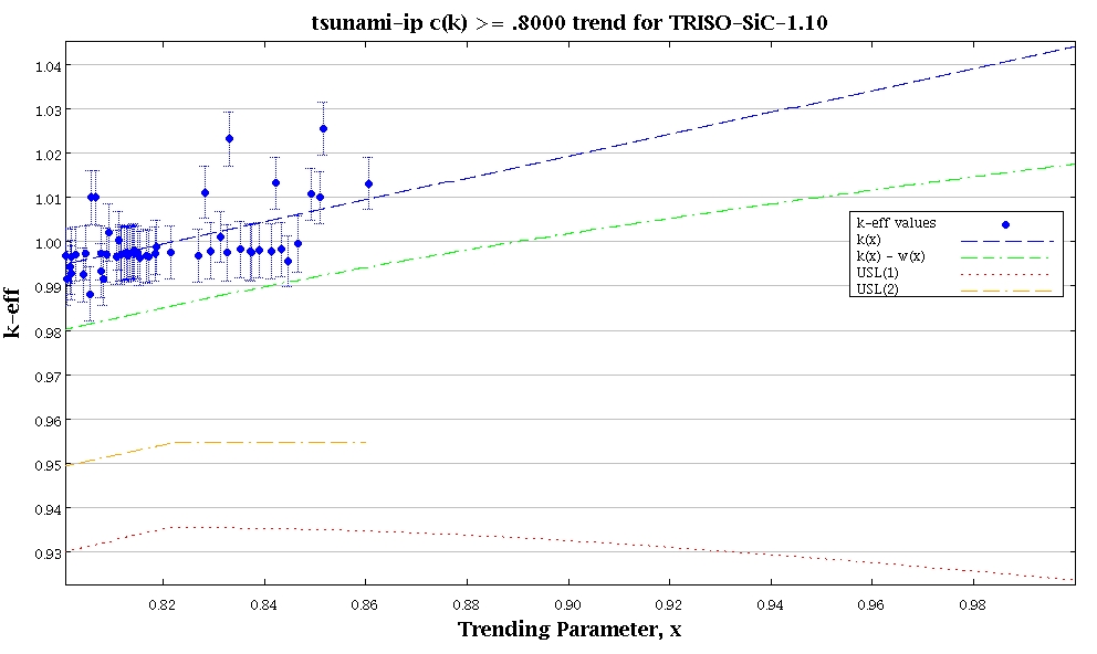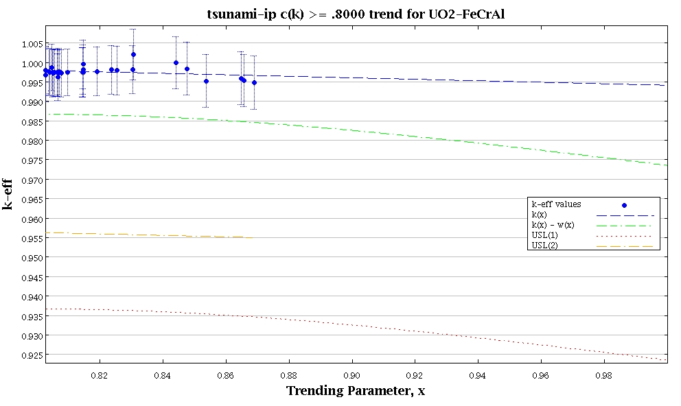At the trending parameter (i.e., ck) value of 1, the average experimental keff, denoted by the “k(x)” curve, is observed to extrapolate to less than 1, which is indicative of a keff underprediction bias. Therefore, this difference between keff equal to 1 and the average experimental keff would be accounted for as part of the criticality safety analysis validation. In this case, the bias was determined to be 585.2 pcm. The corresponding uncertainty based on the single sided lower tolerance limit, denoted by the “k(x) - w(x)” curve, is 2061.7 pcm.