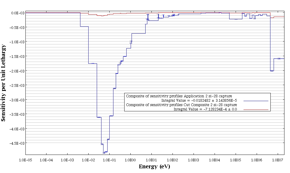Two sensitivity profiles are shown in the figure above for the reaction contributing most to the coverage penalty. In this case it is clear that there aren’t sufficient benchmark experiments containing Si-28 sensitive to the thermal region of the spectrum between 0.01 and 10 eV and for parts of the fast region for energies greater than ~5 MeV.