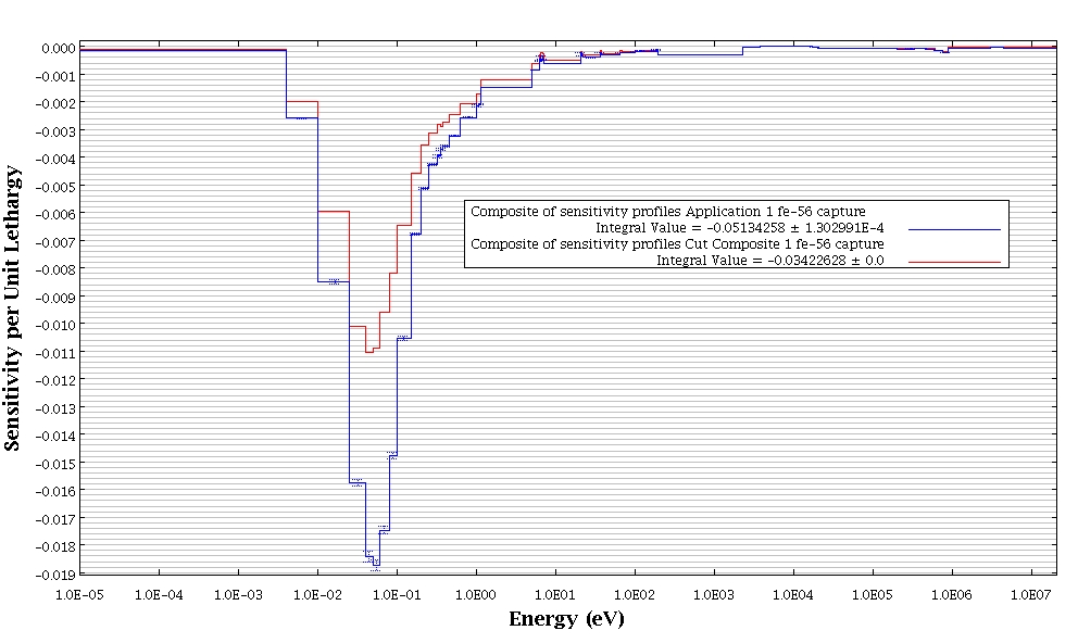 Two sensitivity profiles are shown in the figure above for the reaction contributing most to the coverage penalty. In this case it is clear that there aren’t sufficient benchmark experiments containing Fe-56 sensitive to the thermal region of the spectrum between 0.01 and 0.1 eV.